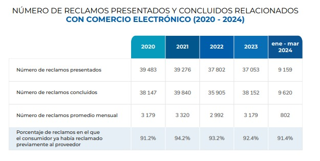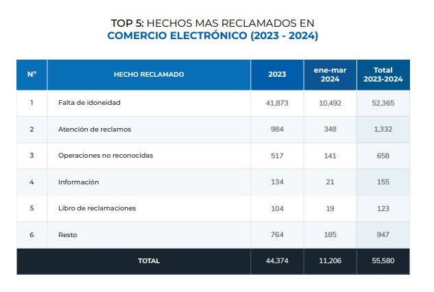 Asimismo, en 2023 y los primeros meses de 2024, se mantuvo un promedio mensual de alrededor de 3,000 reclamos, lo que evidencia que los problemas persisten, a pesar de un sistema de resolución eficiente. Los hechos más reclamados en comercio electrónico durante estos años fueron la falta de idoneidad, atención a reclamos, operaciones no reconocidas y solicitudes de información.